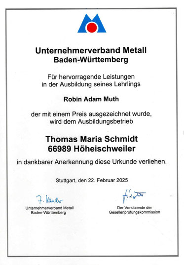 Für seine ausgezeichnete Leistung in der Ausbildung wurde Robin Adam Muth mit einem Preis geehrt. In diesem Zuge wurde auch unser Betrieb vom Unternehmerverband Metall